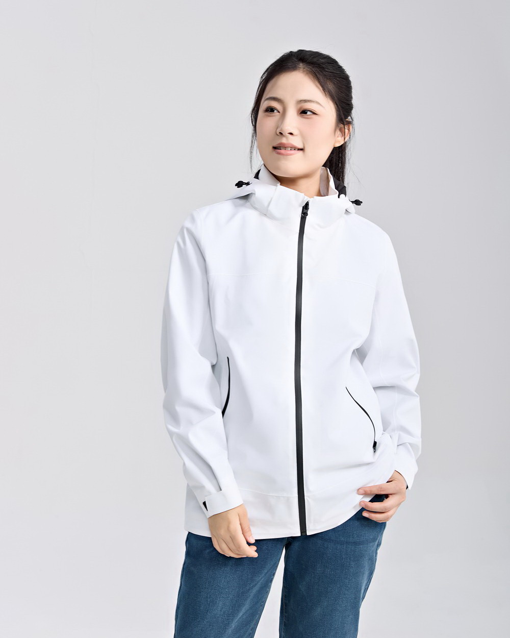 3、有效防风,通过透湿膜复合技术处理,有效将风阻隔在外;可调节帽檐设计,让雨水快速滑落;