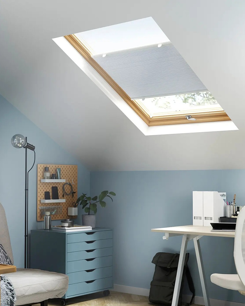 这款卷帘可通过各种方式安装,以遮挡外面的月光、阳光或街灯。你可以从上到下拉合或从下到上拉开卷帘,或者将卷帘拉下一半,半遮盖着窗户